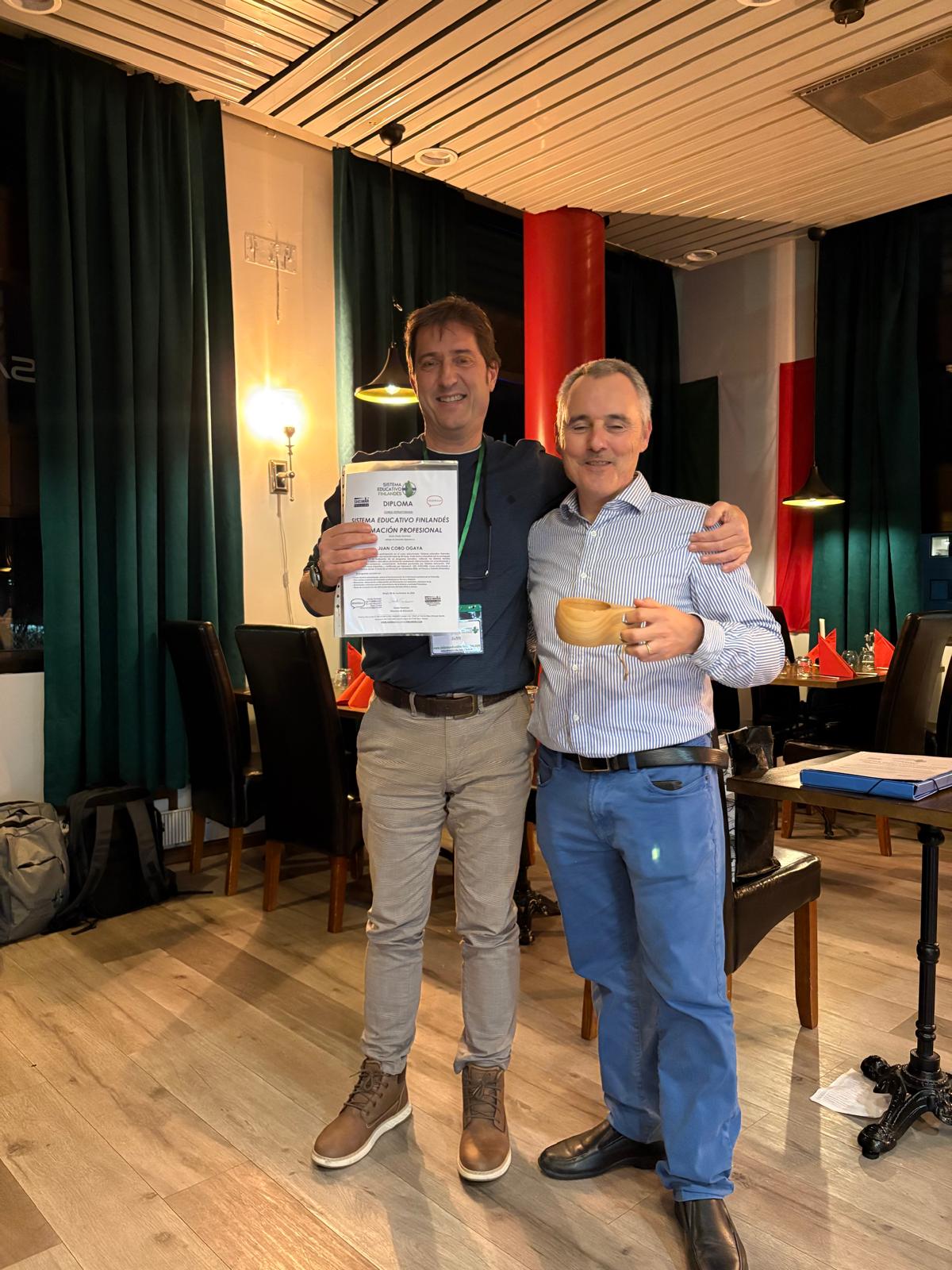 El coordinador de FP Juan Cobo y el profesor Nacho Benito han viajado del 2 al 8 de noviembre a Porvoo, Finlandia para aprender el funcionamiento de la FP en dicho país. Durante toda la semana han recibido formación sobre el sistema edcuativo finalandés y han tenido la posibilidad de visitar varios centros de FP del país. En el curso han participado 25 profesores de centros españoles, con los que han realizado sesiones de trabajo en grupo, reflexionando y poniendo en común los aprendizajes obtneidos y la experiencia vivida.